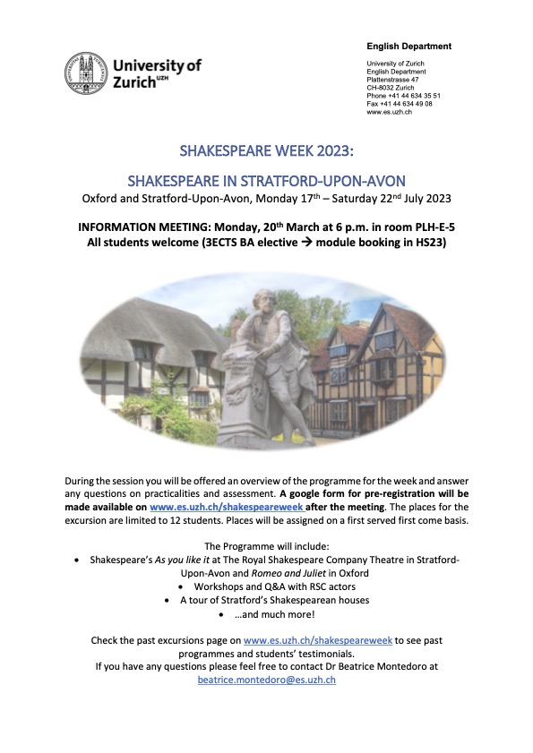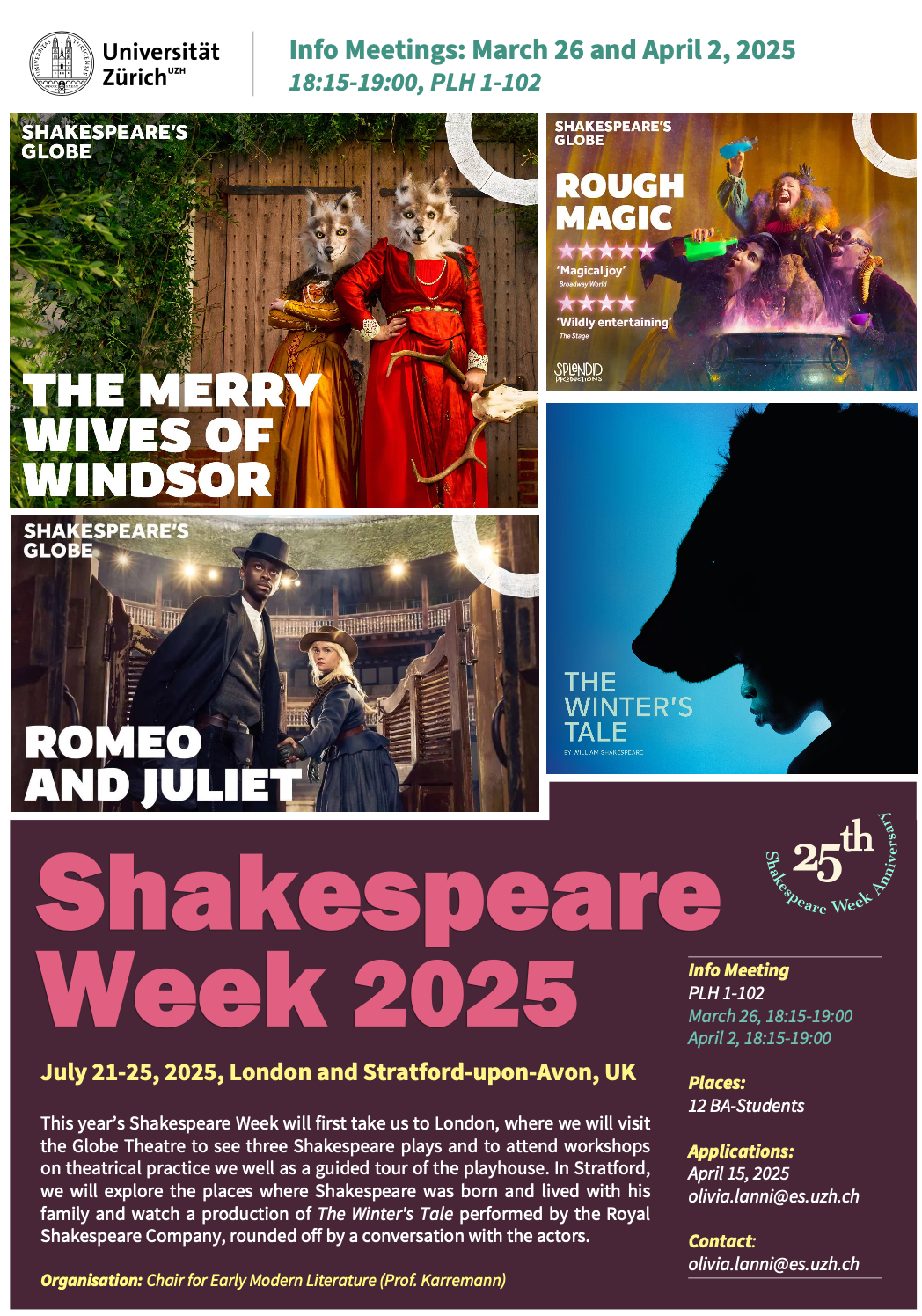 - Motivation letter (ca. 1 page) explaining your interest in attending Shakespeare Week - no prior knowledge of Shakespeare necessary (but helpful!)